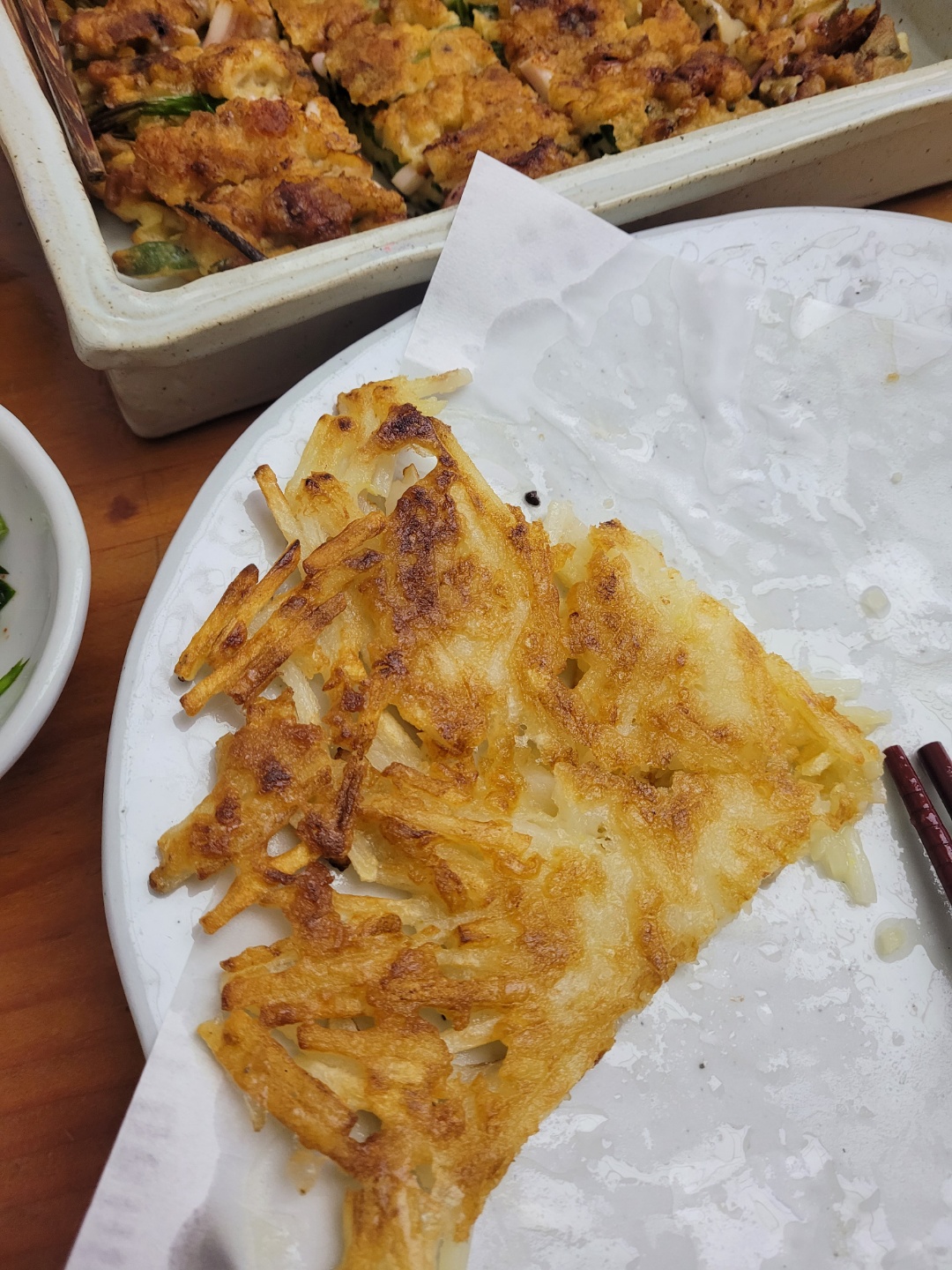 감자전 사진은 ㅠㅠ 먹는데 정신을 팔려.... 잊고 있다가 마지마가 한 조각이 남았을 때, 지인에게 양해를 구하고 급히 찍었네요~~ 양은 더욱 많습니다^^